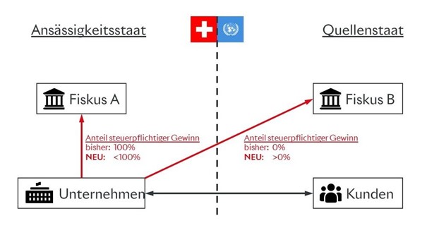 Ist eine Unternehmung grenzüberschreitend – also in mehr als einem Staat tätig – stellt sich die Frage der steuerlichen Ansässigkeit bzw. der Besteuerungshoheit der jeweils involvierten Staaten. Hat eine Unternehmung z.B. in einem Nachbarstaat eine Betriebsstätte, so einigen sich die beiden Staaten seit je her auf einen Verteilmodus, welcher Staat welchen Gewinnanteil bei sich besteuert.